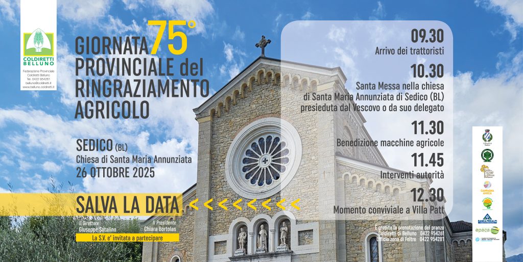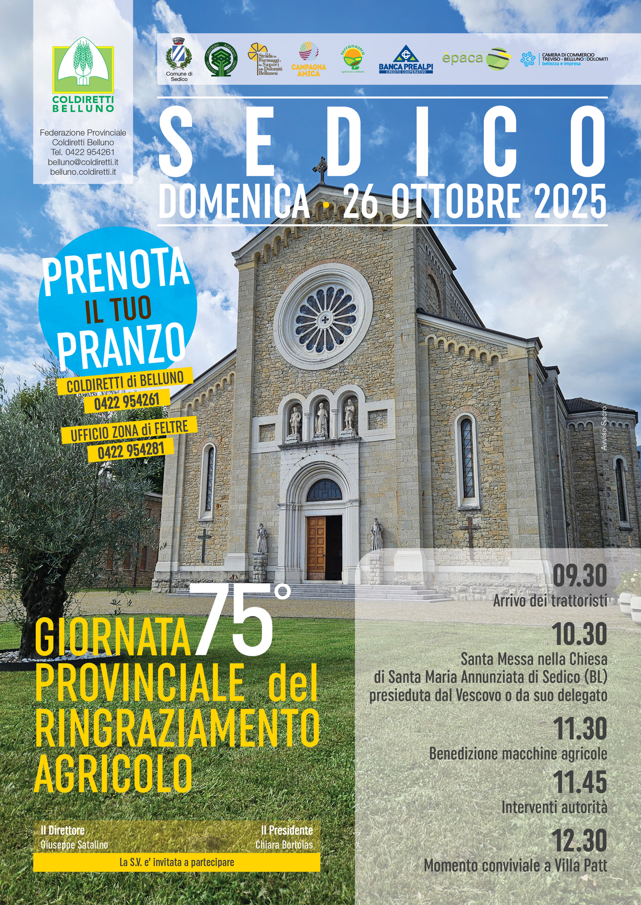 Si celebra domenica 26 ottobre 2025 a Sedico (BL) la 75° Giornata Provinciale del Ringraziamento Agricolo, la tradizionale ricorrenza per rendere grazie del raccolto dei campi e chiedere la benedizione sui nuovi lavori.