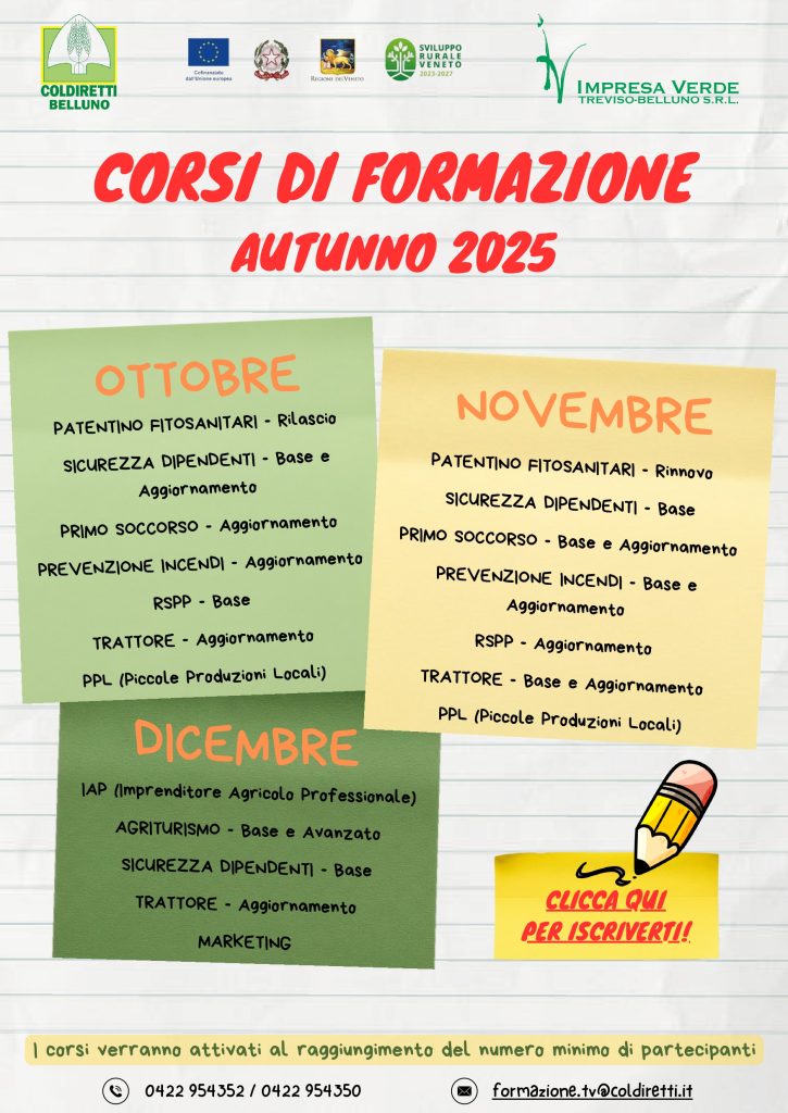 Al via la stagione 2025/2026 per i corsi di formazione organizzati da Coldiretti Belluno | Impresa Verde Treviso Bellluno con svariate proposte.
